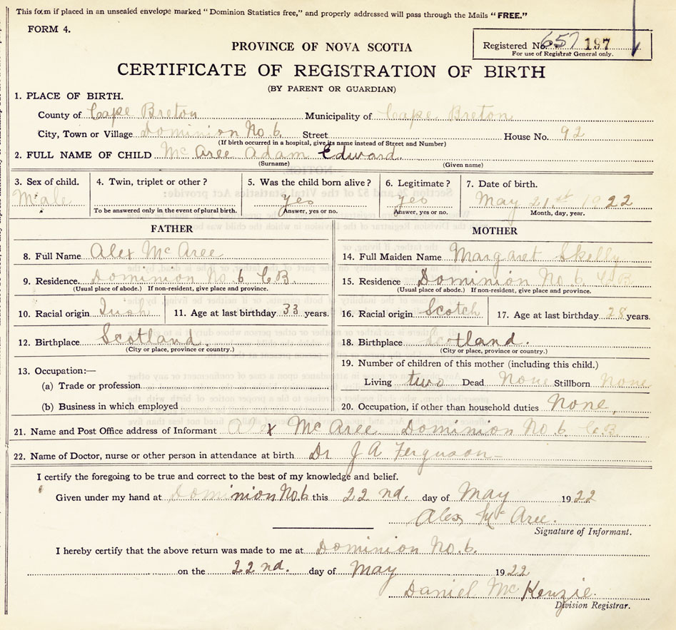 21. Name and Post Office address of Informant Alex McAree Dominion No. 6, Cape Breton