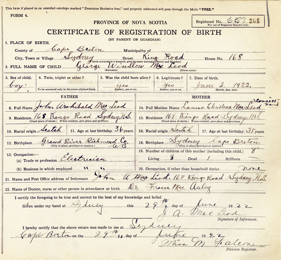 2. FULL NAME OF CHILD MacLeod, George Winslow
