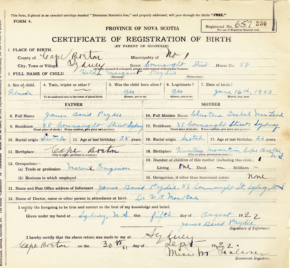 22. Name of Doctor, nurse or other person in attendance at birth Dr. W R MacRae