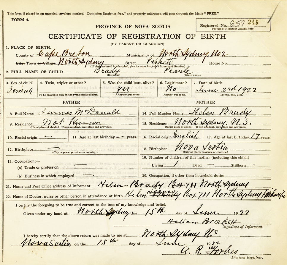 21. Name and Post Office address of Informant Hellen Bradey Box 711, North Sydney