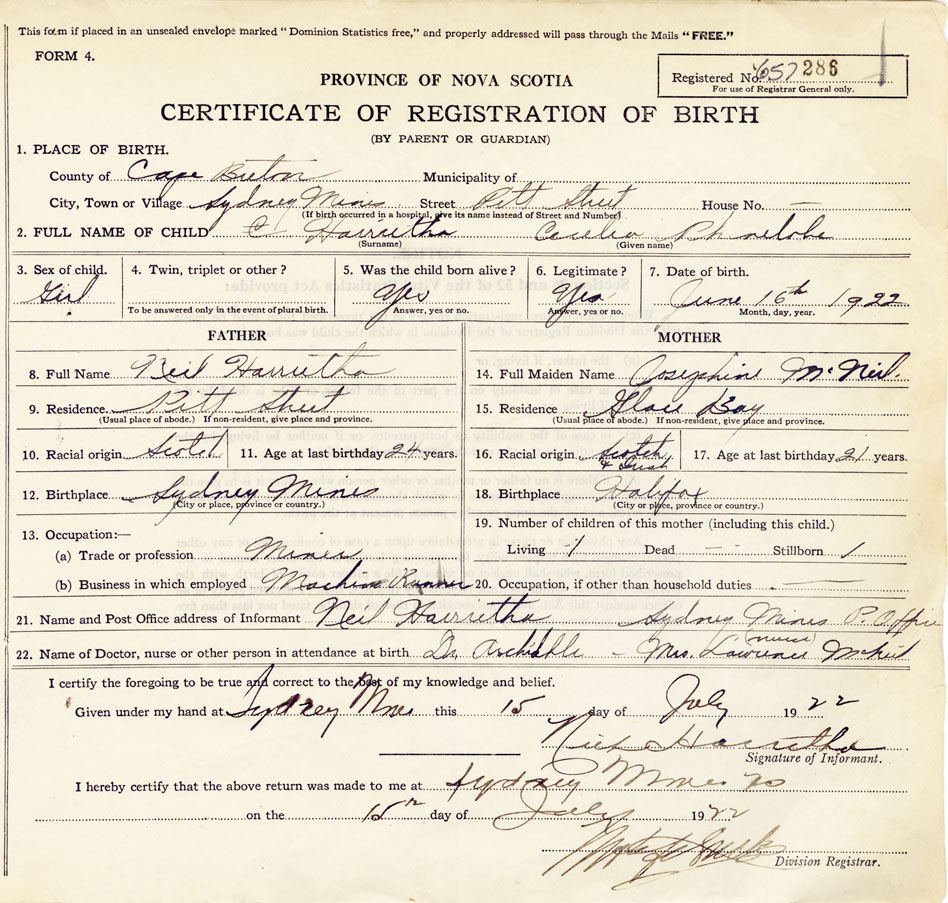 21. Name and Post Office address of Informant Neil Harrietha Sydney Mines Post Office