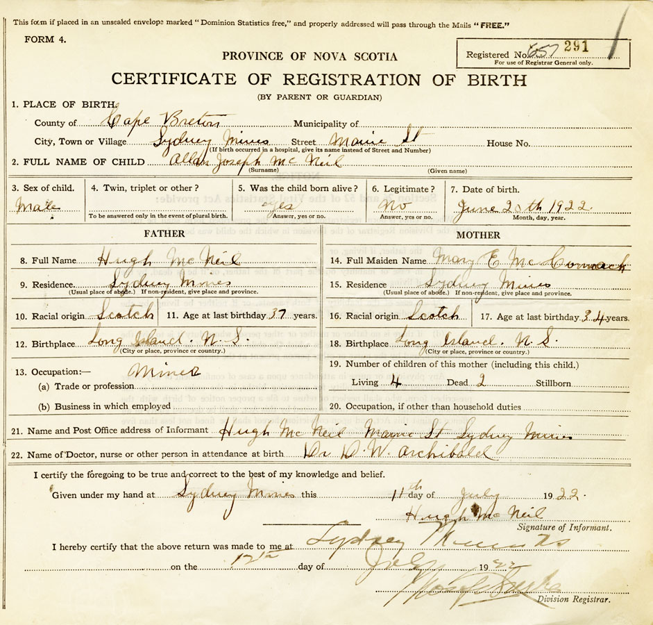21. Name and Post Office address of Informant Hugh McNeil Main St., Sydney Mines