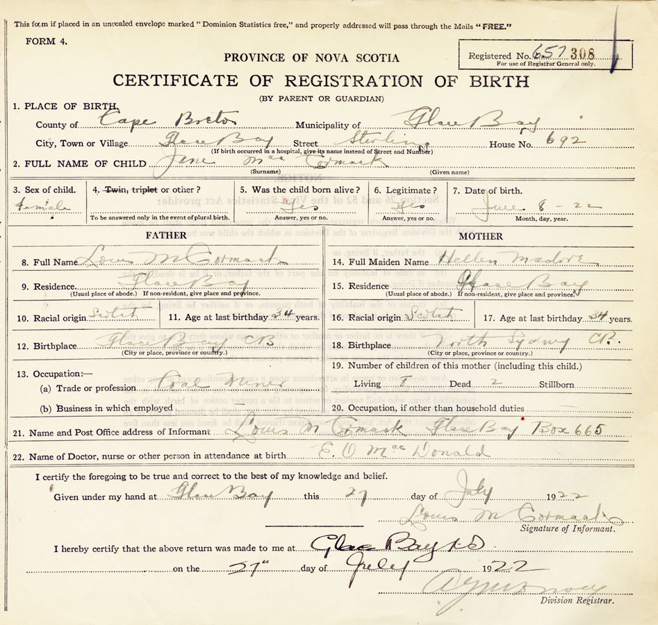 21. Name and Post Office address of Informant Louis McCormack Glace Bay, Box 665