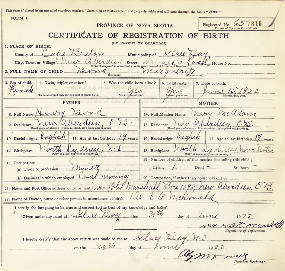 21. Name and Post Office address of Informant Mrs Robert Marshall Box 1098, New Aberdeen, Cape Breton