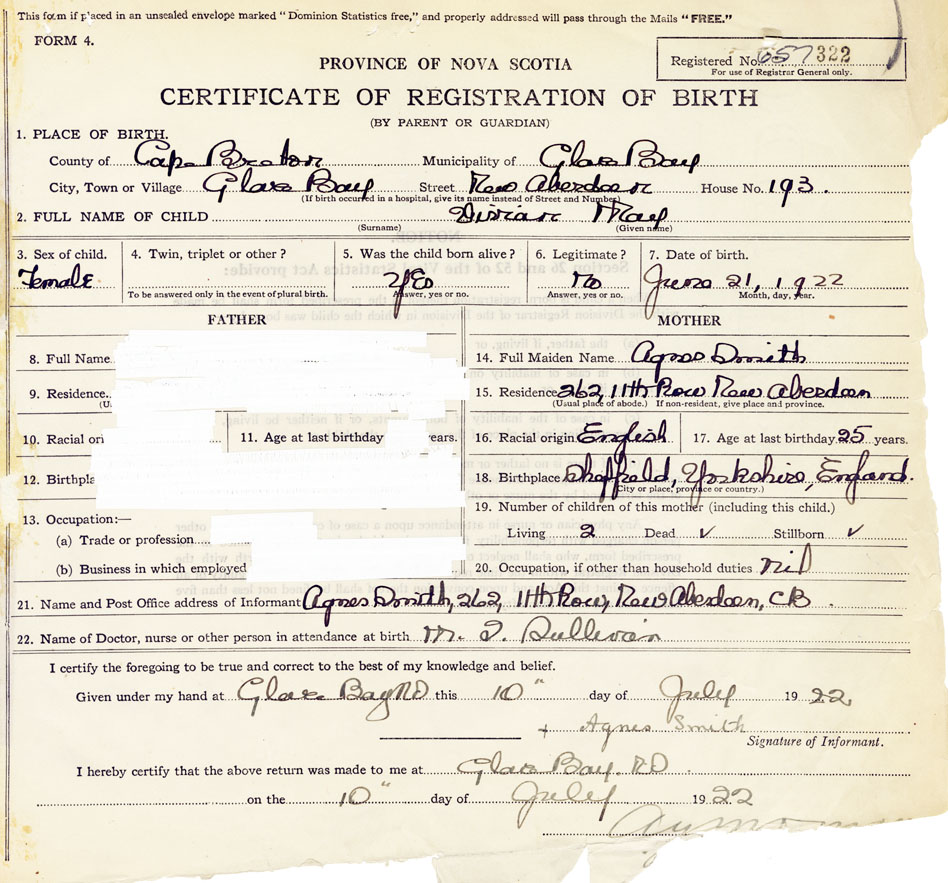 21. Name and Post Office address of Informant Agnes Smith 262, 11th Row, New Aberdeen, Cape Breton
