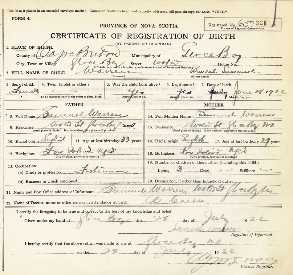 21. Name and Post Office address of Informant Samuel Warren Water St., Glace Bay