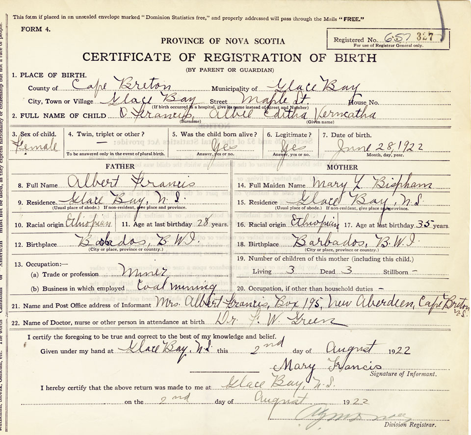 21. Name and Post Office address of Informant Mrs Albert (Mary) Francis Box 195, New Aberdeen, Cape Breton