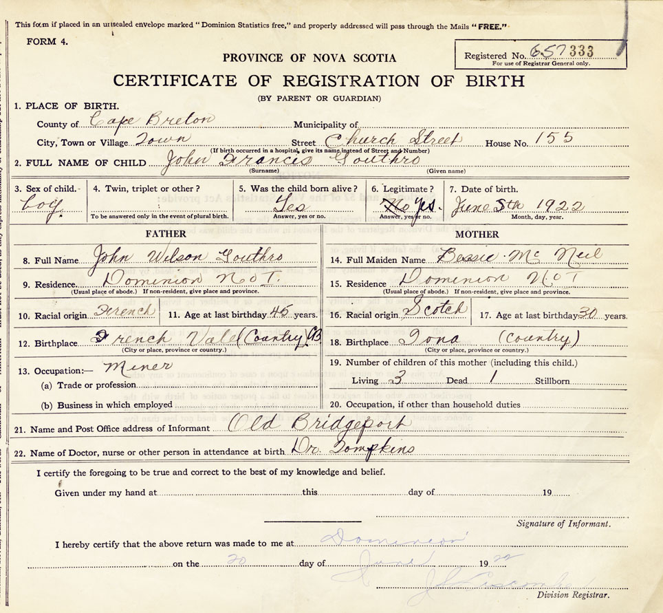 12. Birthplace French Vale, Cape Breton (country)
