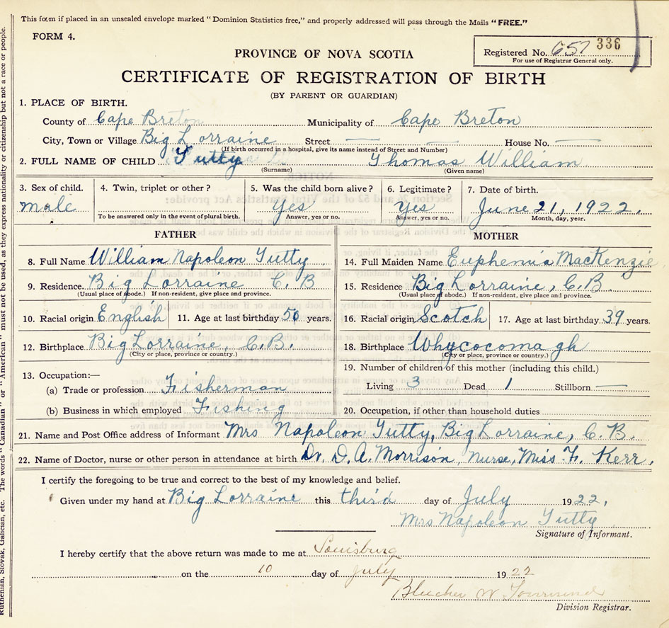 21. Name and Post Office address of Informant Mrs Napoleon Tutty Big Lorraine, Cape Breton