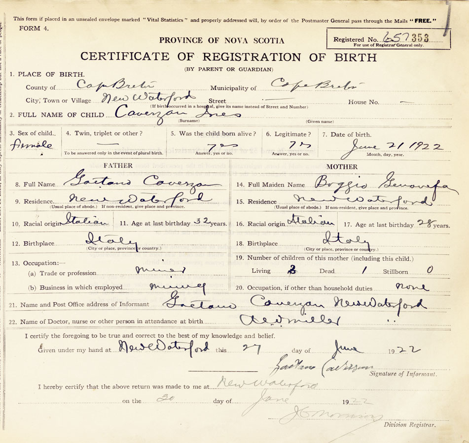 21. Name and Post Office address of Informant Gaetano Caverzan New Waterford