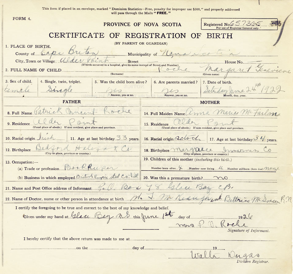21. Name and Post Office address of Informant Mrs P V Roche PO Box 78, Glace Bay, Cape Breton