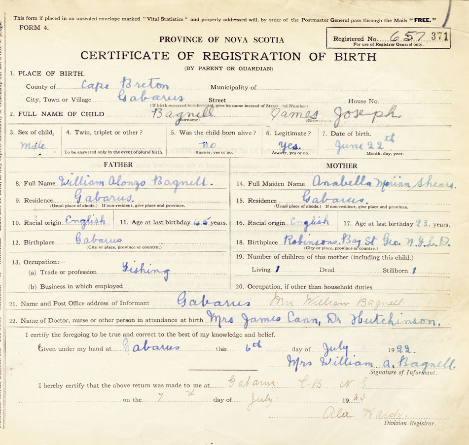 18. Birthplace Robinsons Bay, St. Geo., NFLD