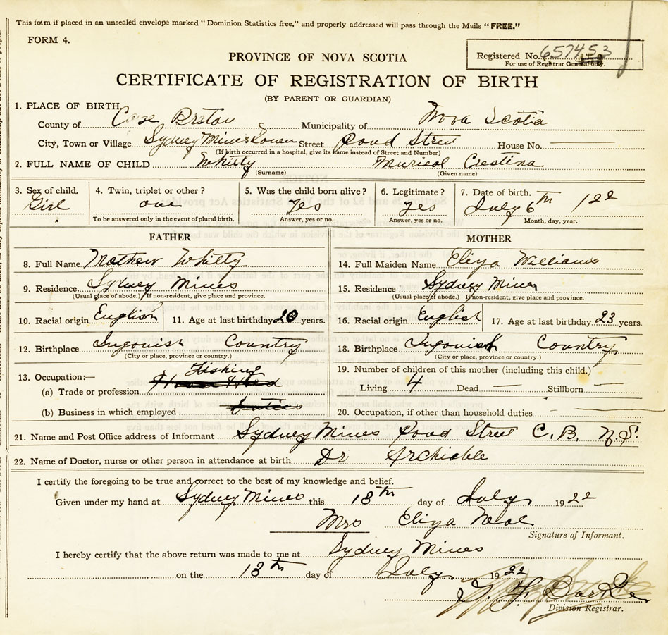 21. Name and Post Office address of Informant Mrs Eliza Neal Sydney Mines, Pond Street, Cape Breton