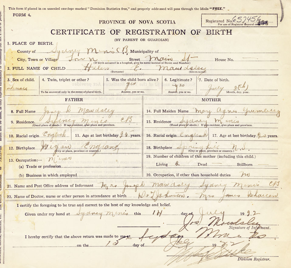 21. Name and Post Office address of Informant Mrs Joseph Mawdsley Sydney Mines