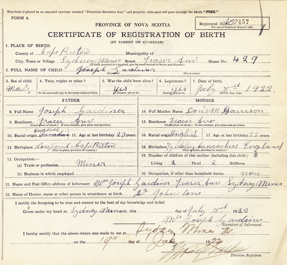 21. Name and Post Office address of Informant Mrs Joseph Gardiner Fraser Ave., Sydney Mines