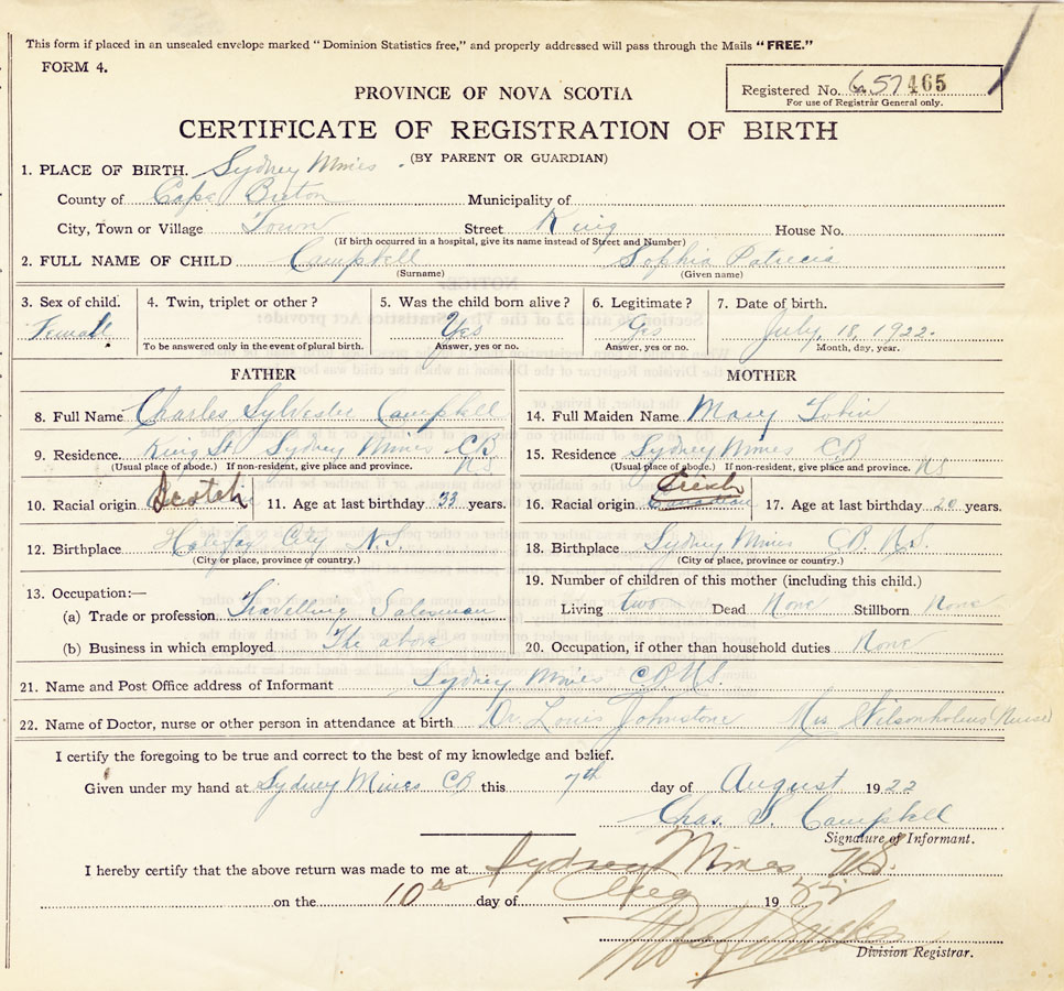 21. Name and Post Office address of Informant Chas. S Campbell Sydney Mines, CB