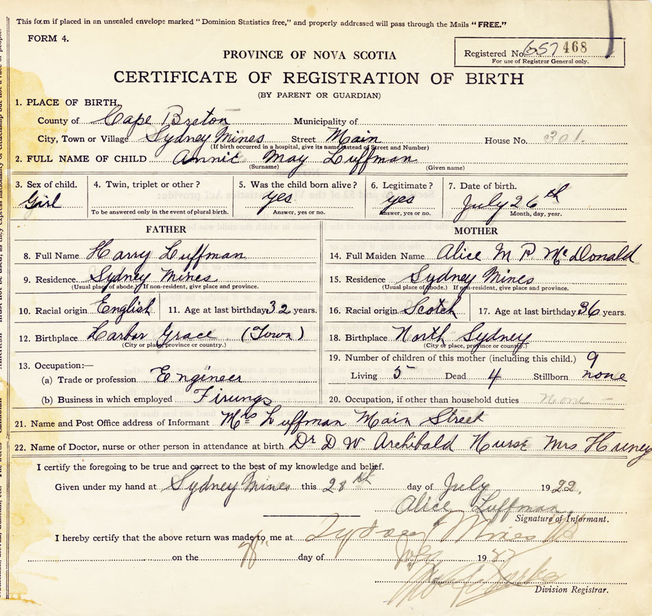 21. Name and Post Office address of Informant Alice Luffman Main Street, Sydney Mines