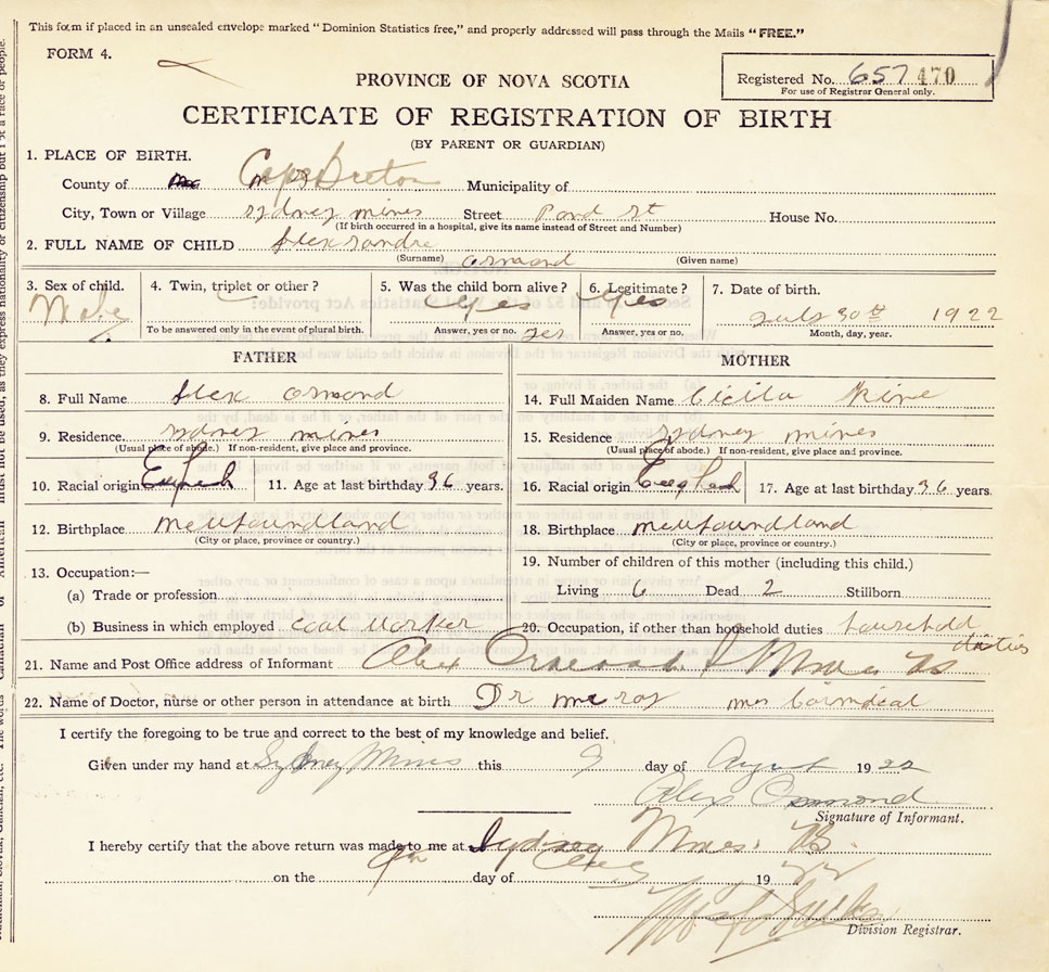 21. Name and Post Office address of Informant Alex Osmond Sydney Mines