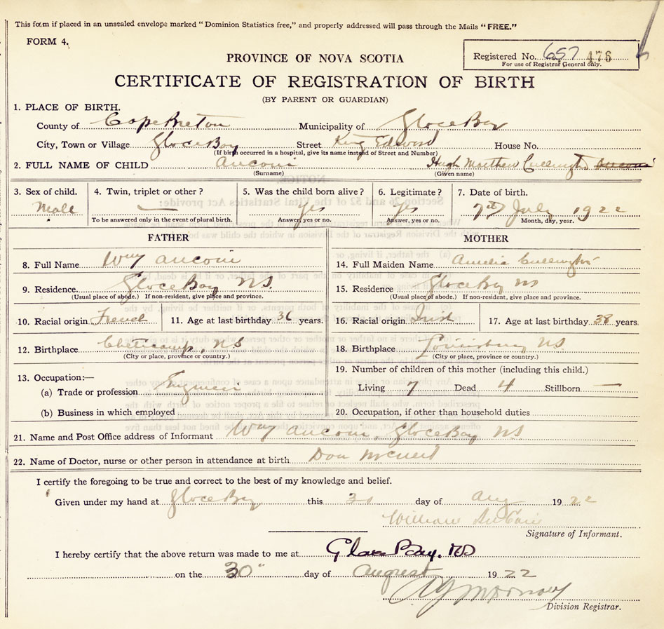 21. Name and Post Office address of Informant William Aucoin Glace Bay
