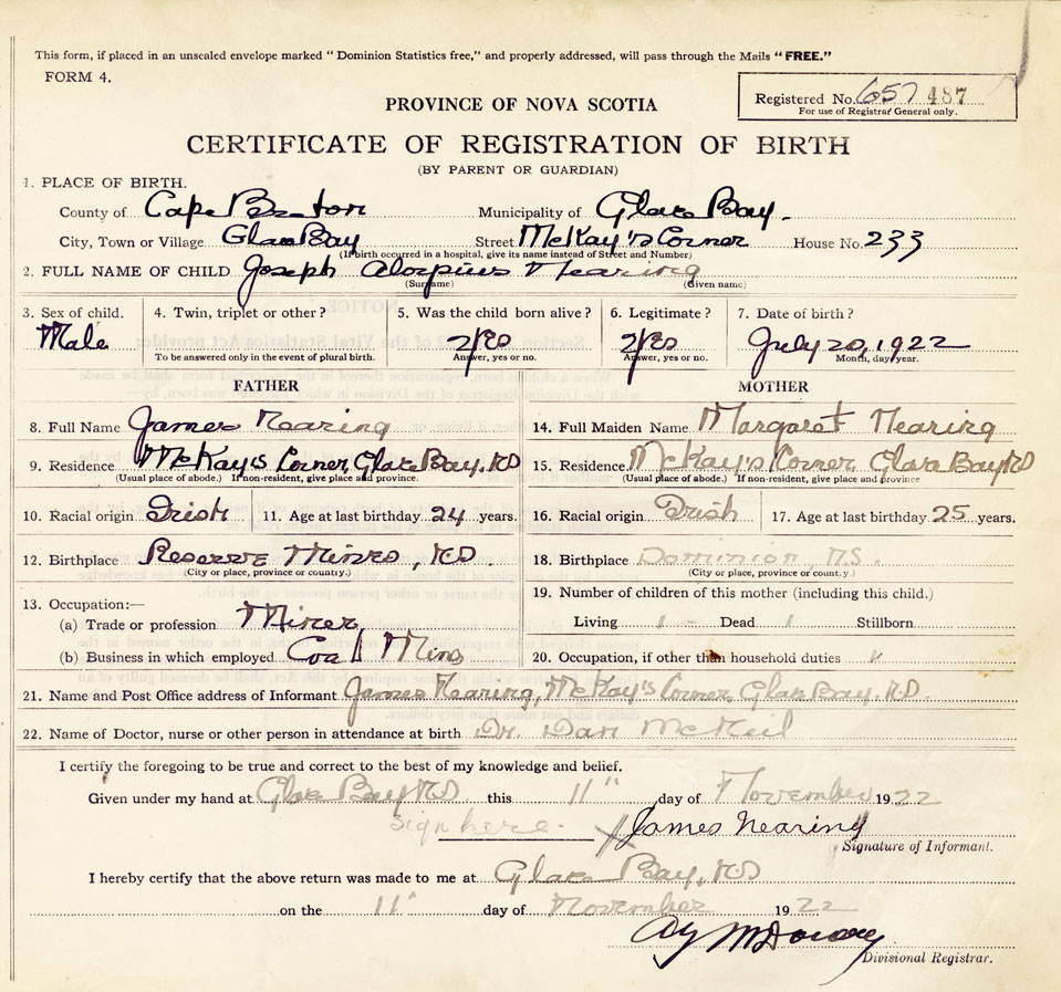 21. Name and Post Office address of Informant James Nearing McKays Corner, Glace Bay