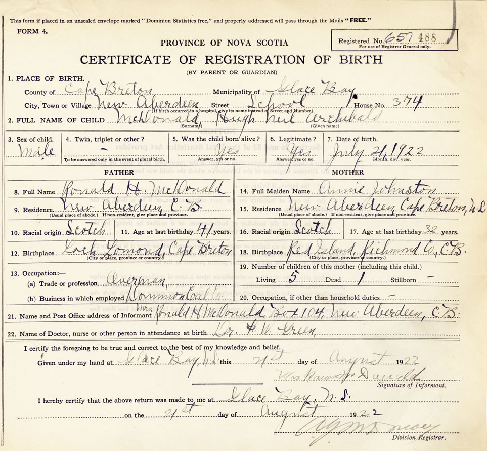 21. Name and Post Office address of Informant Mrs Ronald H McDonald Box 104, New Aberdeen, Cape Breton