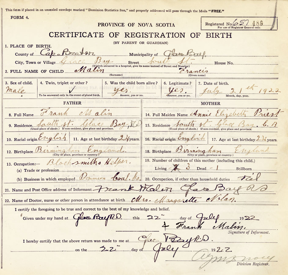21. Name and Post Office address of Informant Frank Malin Glace Bay
