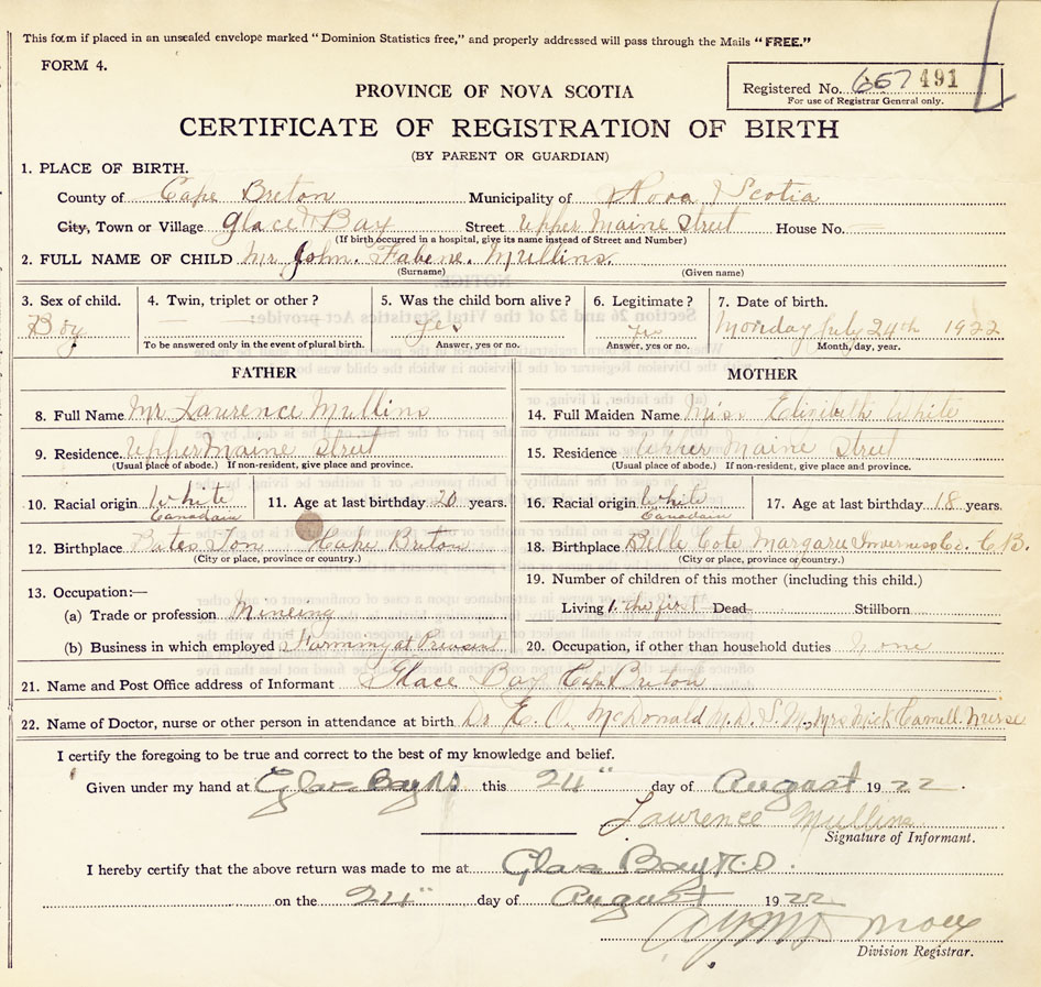 21. Name and Post Office address of Informant Lawrence Mullins Glace Bay, Cape Breton