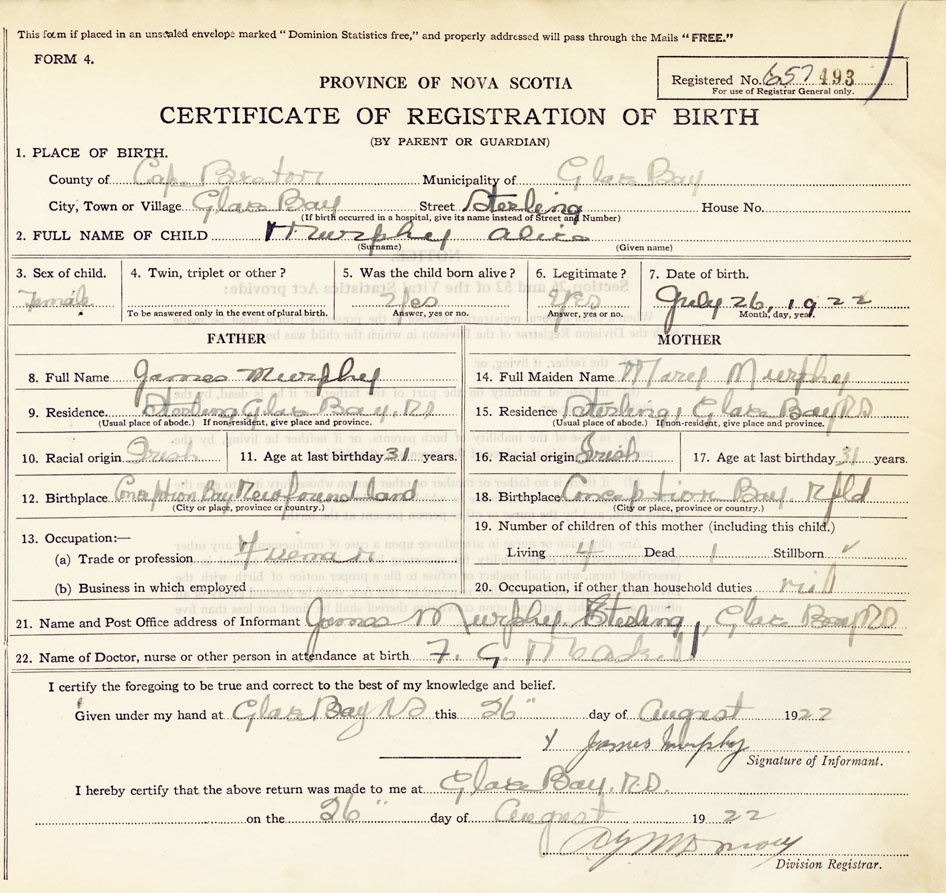 21. Name and Post Office address of Informant James Murphy Sterling, Glace Bay