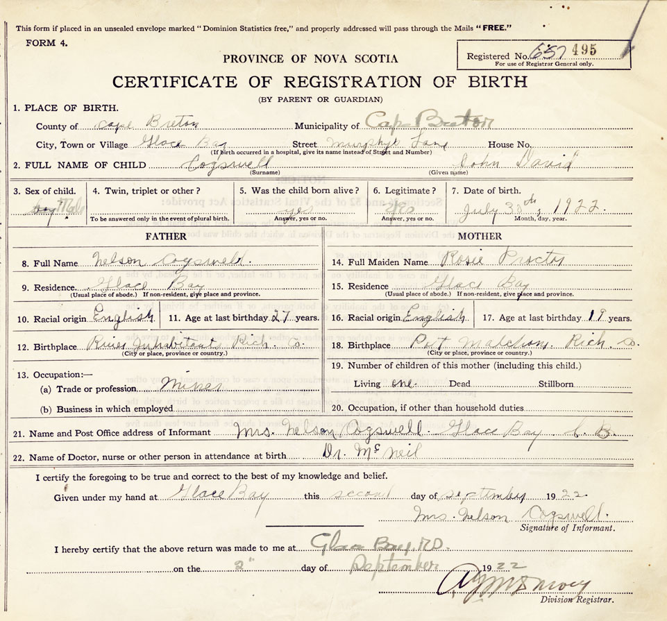 21. Name and Post Office address of Informant Mrs Nelson Cogswell Glace Bay, Cape Breton