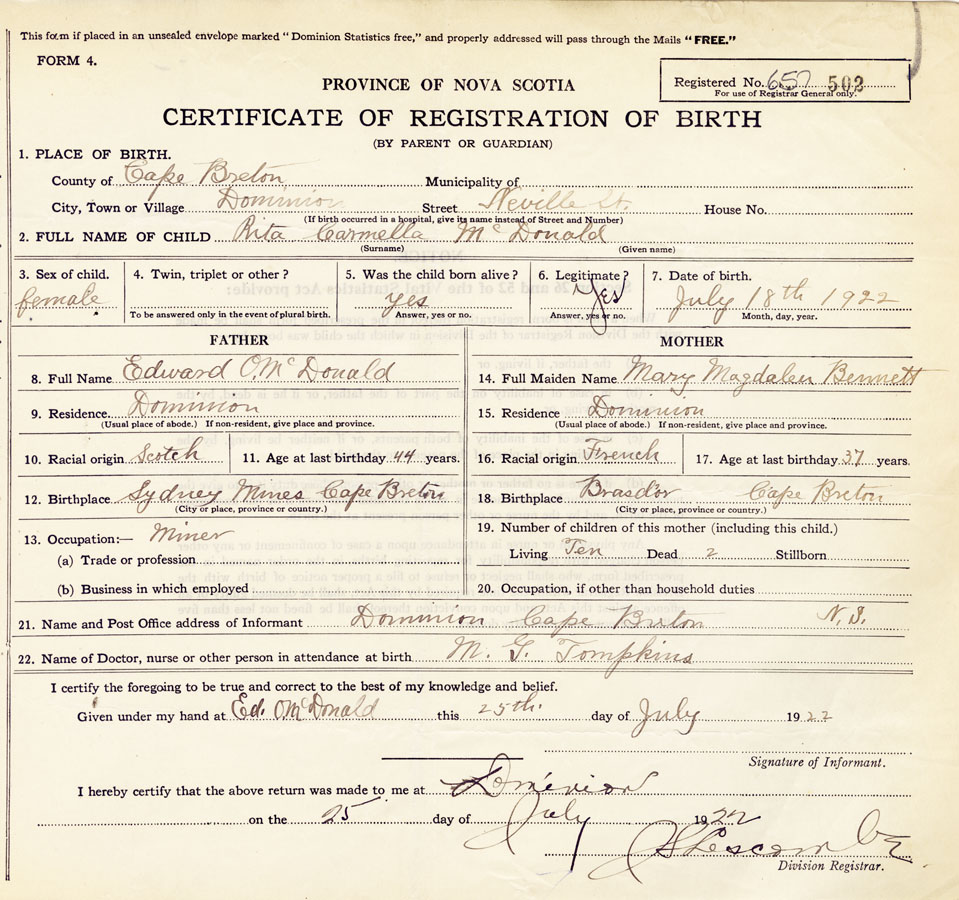 21. Name and Post Office address of Informant Dominion, Cape Breton