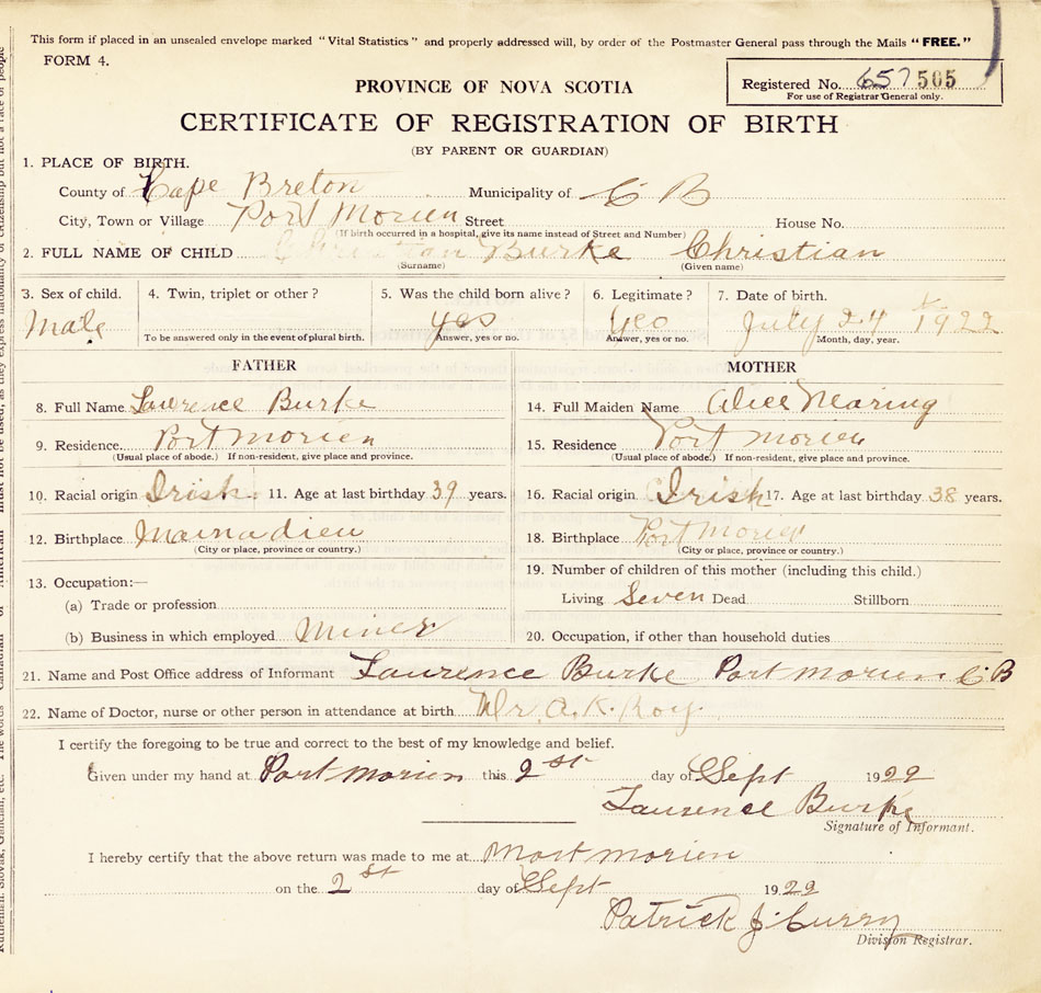 21. Name and Post Office address of Informant Laurence Burke Port Morien, C.B.