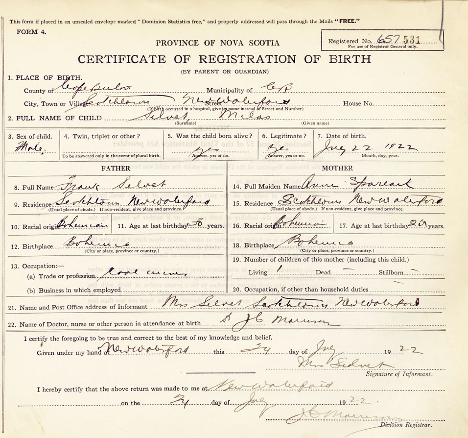 21. Name and Post Office address of Informant Mrs Selvet Scotchtown, New Waterford