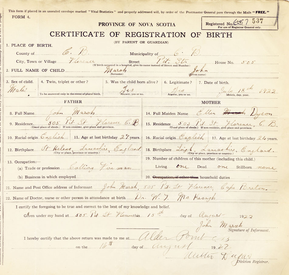 21. Name and Post Office address of Informant John Marsh 505 Pit St., Florence, Cape Breton