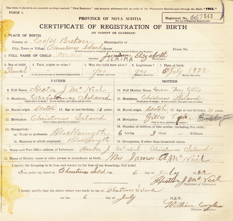 21. Name and Post Office address of Informant Hector J McNeil Christmas Island