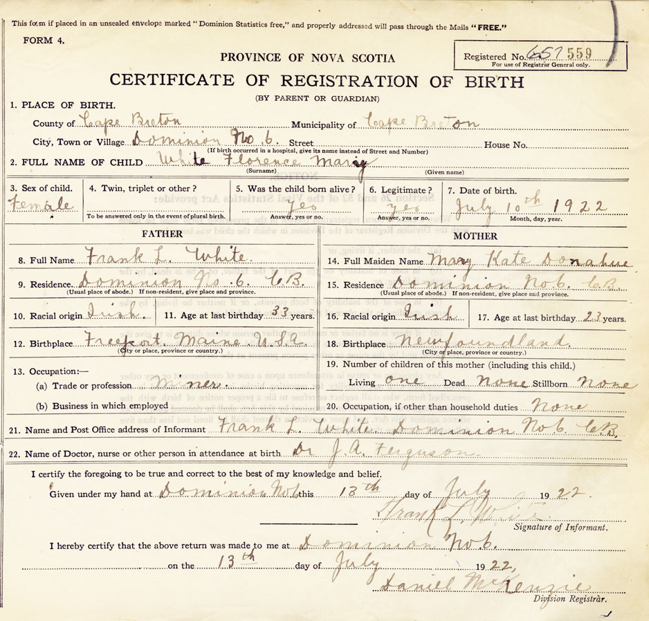 21. Name and Post Office address of Informant Frank L White Dominion No. 6, Cape Breton