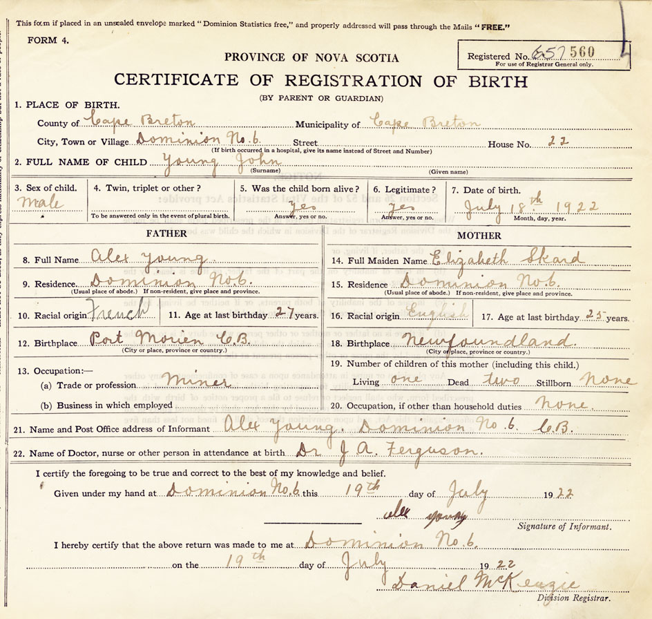21. Name and Post Office address of Informant Alex Young Dominion No. 6, Cape Breton