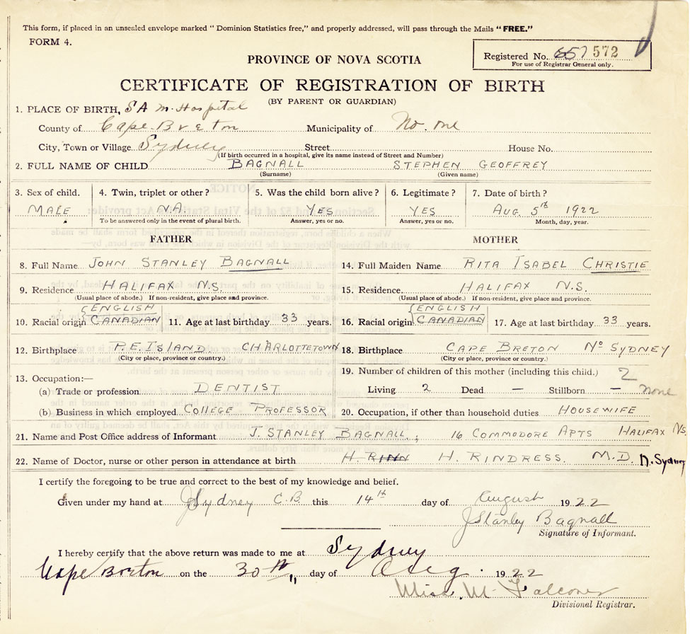 21. Name and Post Office address of Informant J Stanley Bagnall 16 Commodore Apts., Halifax