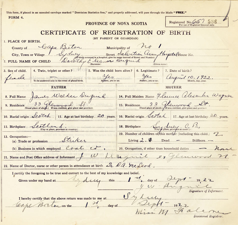21. Name and Post Office address of Informant J W Duguid 33 Glenwood St, Sydney