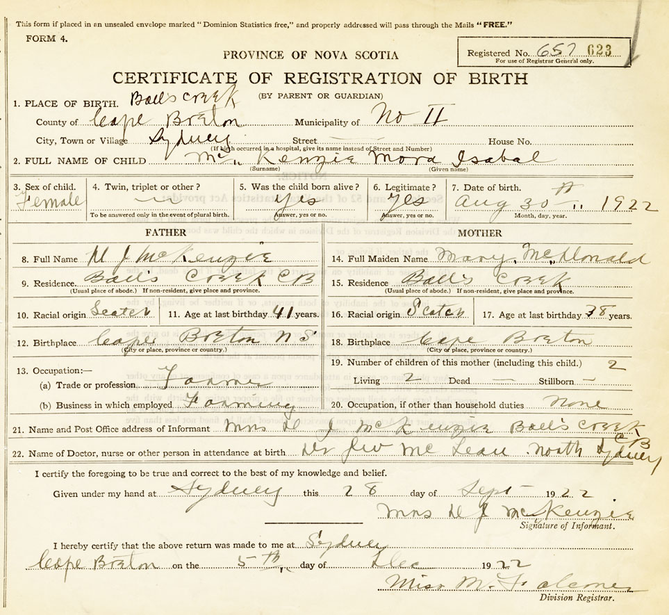 21. Name and Post Office address of Informant Mrs D J MacKenzie Balls Creek, North Sydney, Cape Breton