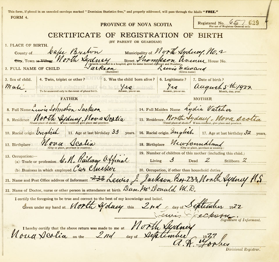 21. Name and Post Office address of Informant Lewis J Jackson Box 233, North Sydney