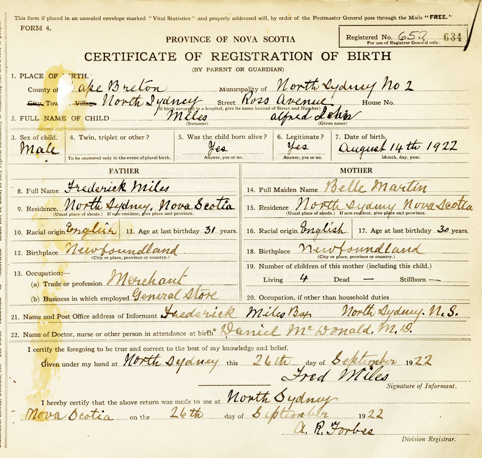 21. Name and Post Office address of Informant Frederick Miles Box, North Sydney, N.s.