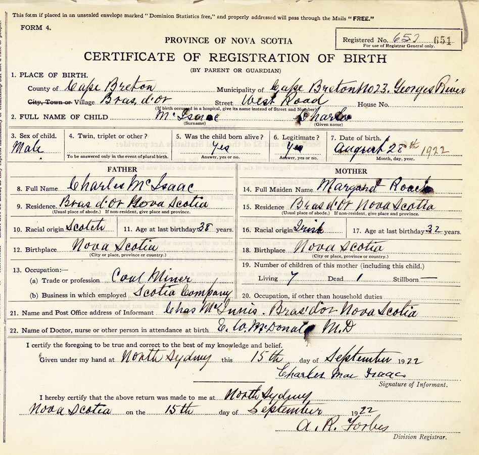 21. Name and Post Office address of Informant Charles MacIsaac Bras d'Or