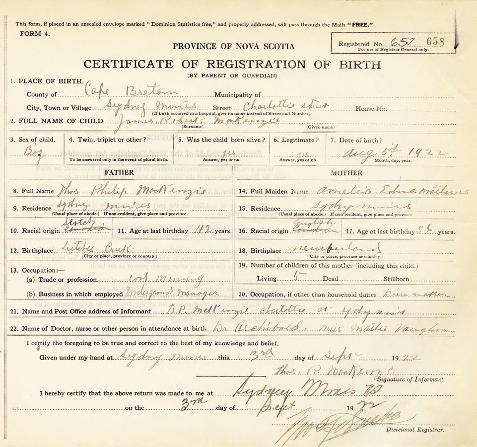 21. Name and Post Office address of Informant Thomas P. MacKenzie Charlotte St., Sydney Mines