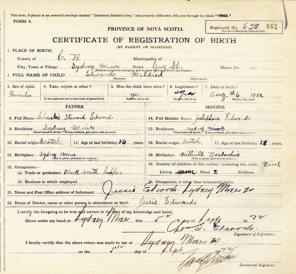 21. Name and Post Office address of Informant Jessie Edwards (Chas. S Edwards signature) Sydney Mines