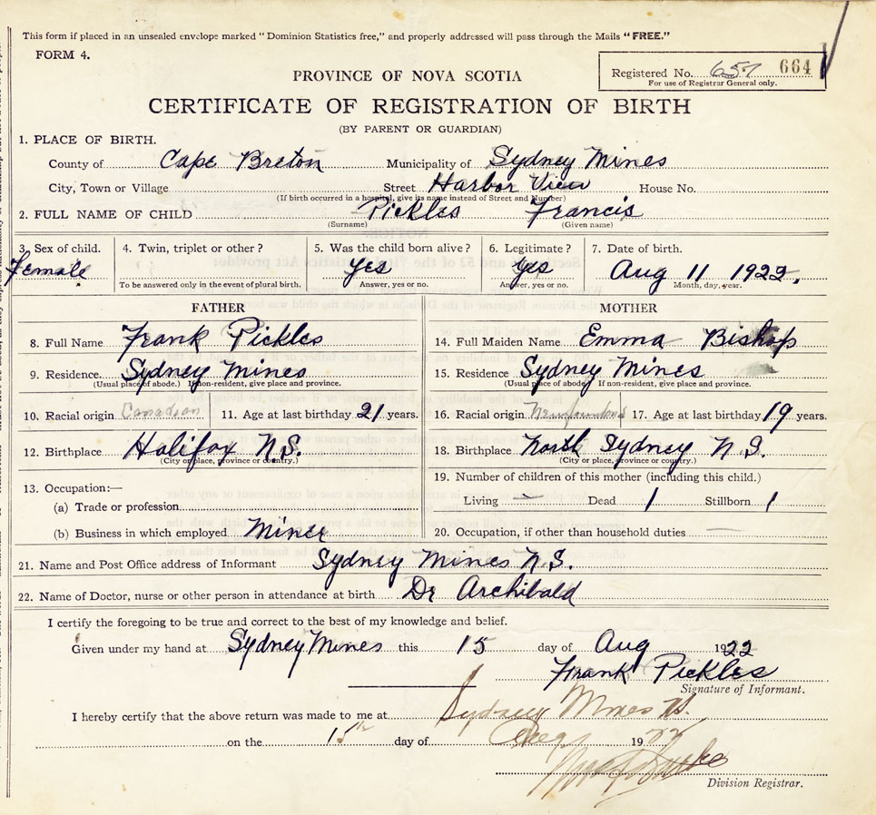 21. Name and Post Office address of Informant Frank Pickles Sydney Mines