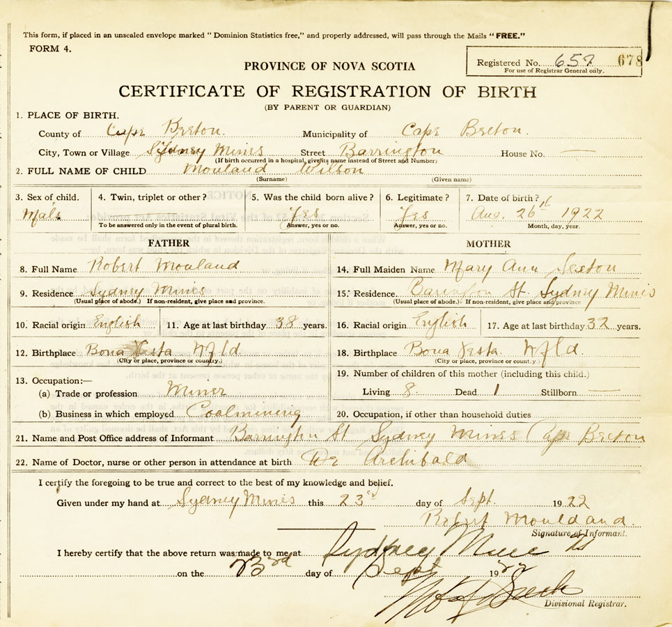 21. Name and Post Office address of Informant Robert Mouland Barrington St., Sydney Mines, Cape Breton