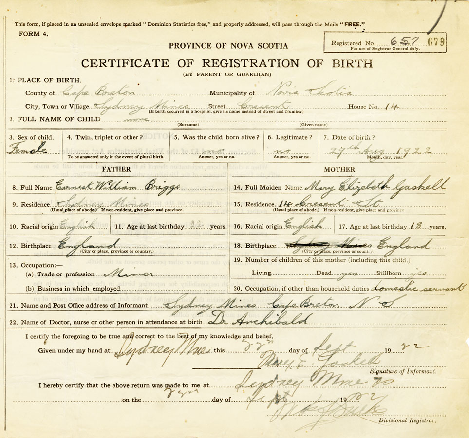 21. Name and Post Office address of Informant Mary E Gaskell Sydney Mines, Cape Breton