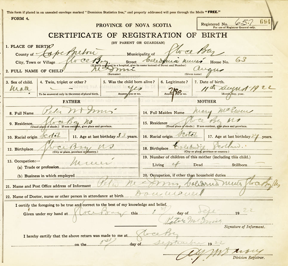 21. Name and Post Office address of Informant Peter McInnis Caledonia Mines, Glace Bay