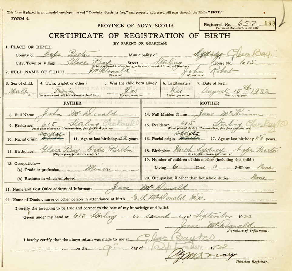 18. Birthplace North Sydney, Cape Breton