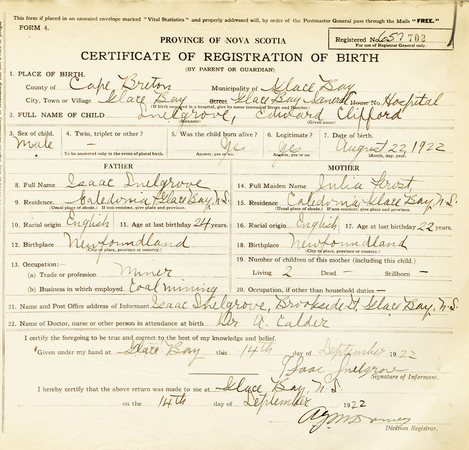 21. Name and Post Office address of Informant Isaac Snelgrove Brookside St., Glace Bay